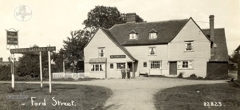 At some stage, the building became an inn. It is known that the parlour part of the building was used as a butcher's shop, which is shown in an old photograph. This is probably why the name, the Shoulder of Mutton, was taken up. As with the Three Horse Shoes and the Vulcan, both Fordham pubs, and both associated with the trade of the blacksmith or farrier, inns and taverns often took a name that was associated with a nearby or in-house trade. The original owner of the building was probably a yeoman farmer who owned land in the area and provided work for others in Fordham. The house was built next to the river and close to the ford that would have existed on the Colchester to Halstead road. It would be interesting to search through Fordham Wills and Inventories of past residents to see whether a family can be identified who might have lived there at some time.