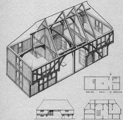 Referring to the typical plan layout shown below (this is not necessarily exactly as the Shoulder was), the original design (pre 1600) would have comprised a central hall, fully open to the roof, with a hearth in the centre for warmth. It is unlikely that cooking was done here due to the risk of setting fire to the building, this probably being done in a separate building close by, now gone. The smoke from the hearth would percolate up into the roof space and find its way out through windows and gaps in the tiles.