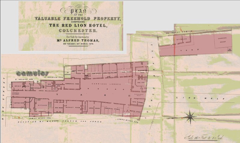 Walk through the archway, where you will see George and the Dragon carved into the ancient framework. This was a reference to the Dukes of Norfolk holding the heraldic Order of the Garter. You are now in Red Lion Yard, the old stable yard, where you will see a variety of little shops. Here is a map from 1879 that shows how this area used to be laid out. No shops, no covered way, No Culver Street. No, this was a vibrant space, filled with the trappings associated with a coaching inn, mostly stabling for horses, spaces for tack and carriages, a boot store, a kitchen, a bar for the coachmen and perhaps the stable workers. Just imagine the sounds and the smells of that bygone time. This was where a stage coach of old, would arrive in Colchester and make its way directly to the Red Lion, the landlord at the ready as the coachman skilfully steers his coach and horses through the massive gates - remembering to remove his hat and to duck, for fear of knocking his block off - the landlord then signalling for his servants to close the gates, thus ensuring that the passengers were his, not the George's, customers for the night. The romance of those coaching days, sadly, a thing of the past.