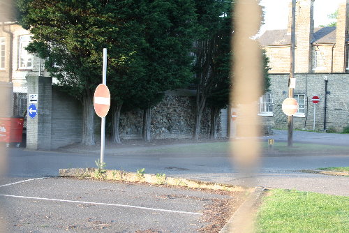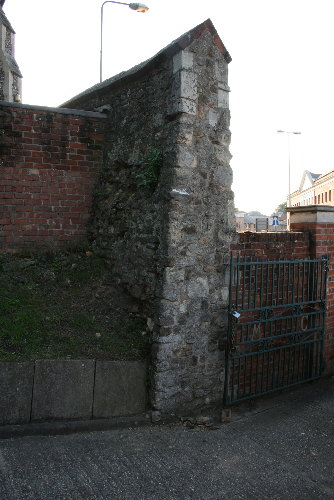 Here, a doorway into military premises shows various stone carvings that must once have decorated a section of the abbey. Also, evidence of the abbey's outer perimeter wall in Flagstaff Road, with evidence at low level of drains or windows. Note the use of reclaimed Roman materials.