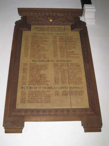 A list of incumbents from St Nicholas and St Runwald Churches, both demolished.