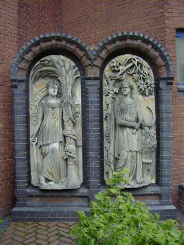 The building was built in 1845 as our corn exchange, then becoming our reperatory theatre and, finally, after a period of redundancy in the 1970s, a bank. These two sculptures are (we believe) depictions of the Greek goddess Demeter (known by the Romans as Ceres) and were intended to represenent ancient and modern agriculture. They may have been made to designs by Raphael Brandon. Demeter was the sister of Zeus. Her name means "barley-mother" or "mother earth" and goddess of fertility. Sacred to her are livestock and agricultural products (with the emphasis on corn), poppy, narcissus and the crane. In the left hand sculpture she holds a spade. She is holding on to a tree of some sort. There is also a ring of various signs of the zodiac. In the right hand sculpture she holds a sickle and a sheaf of corn. An elaborate vine is also depicted.