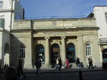 ...we have some fine sculptures at St Mary's car park, which was opened in 1981. Those shown in the following picture originally came from the two niches (now windows) in the building previously known as the Albert Hall in High Street (shown inset, one modern day, one 1870s). However we cannot be sure that they were the actual ones shown in various old pictures of the building, as they look quite modern. They may have been intended for replacement of older ones. Can anybody answer this for us please? It later became the Co-operative Bank.