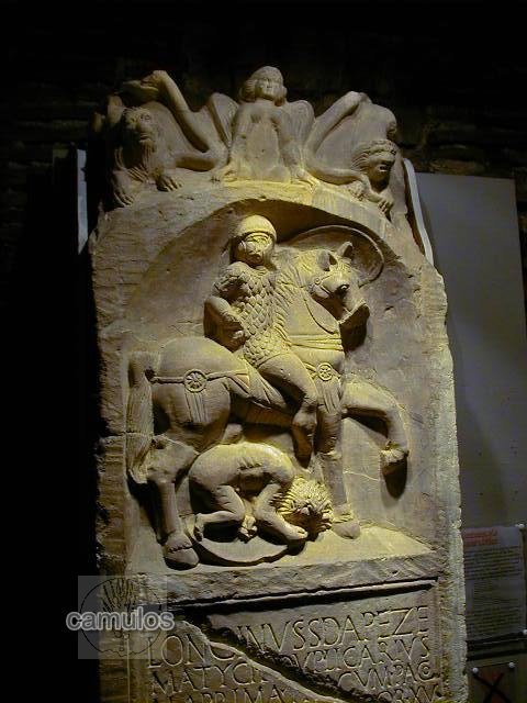 The tombstone shows fine detail of his attire, in particular, detail of the scale-armored cuirass (lorica squamata), a coolus helmet, an oval shield and the elaborate bronze phalerae covering the strapping on the horses harness. The fallen warrior (presumably representative of a Briton) is in a foetal position being trampled underneath the horse. A powerful message, bound to have angered the indigenous population. His spear has been broken in antiquity.