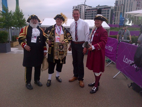 "Town Crier heralds the Olympics." Robert had the honour of heralding the start of London 2012 from the gardens of Westminster and took part in a continuous peel of bells (including Big Ben, Speaker John Bercow and MP Dianne Abbot) that latest for 3 minutes on the opening morning of the games. Later the same day he had the role of greeting athletes as they assembled in the Olympic Village during their preparations for the opening ceremony. The busy Olympic schedule continued with greetings for the Closing Ceremony of the Modern Olympics as well as similar roles with the Paralympics.
